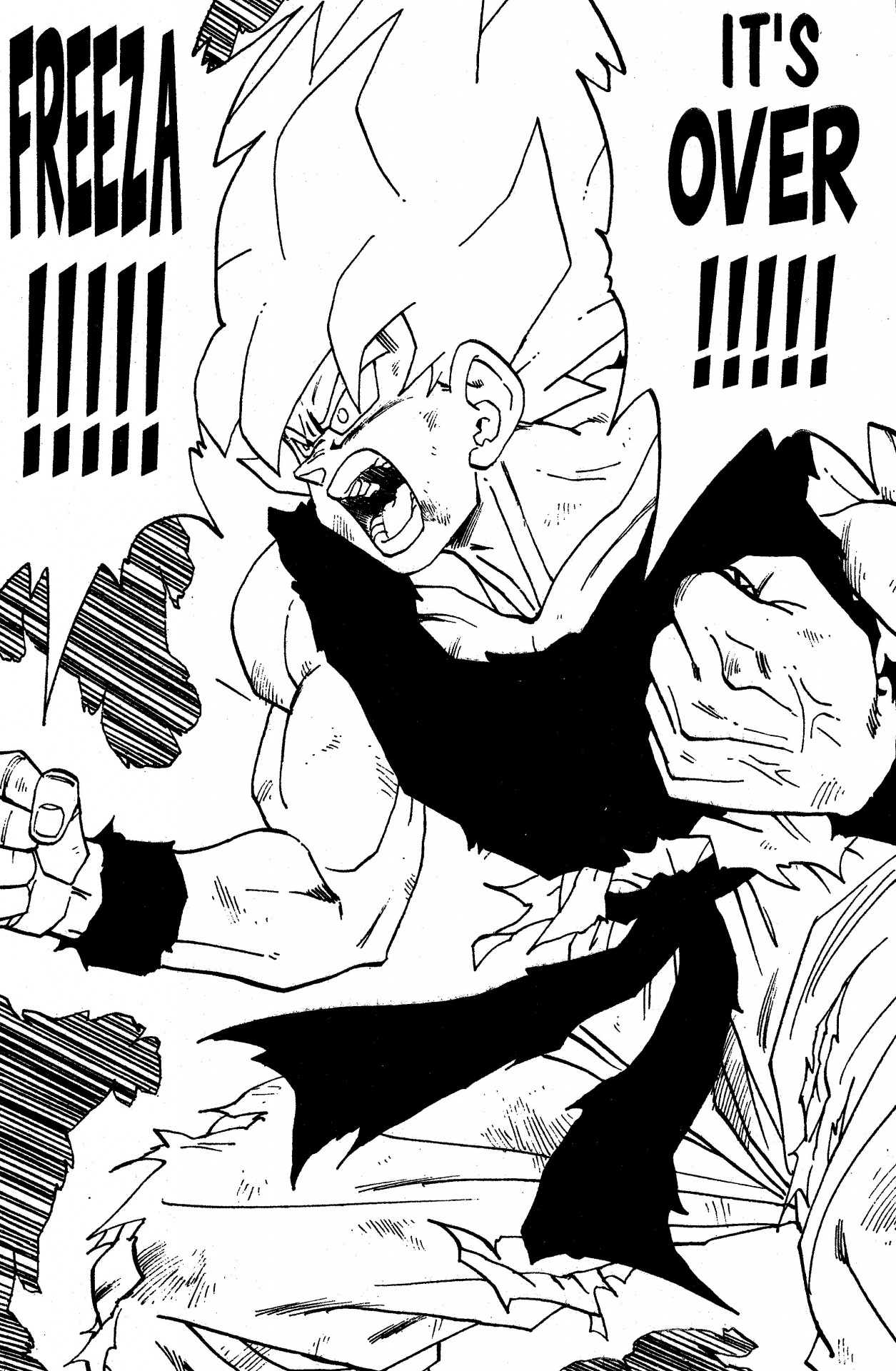 Bis zu seiner Verwandlung hatte Goku einige verheerende Schläge erlitten , als er versuchte, Frieza zu Frieza, der nur 50% seiner wahren Kraft nutzte. Aber nachdem er Super Saiyan, konnte Goku das Blatt wenden und den teuflischen Frieza in die Seile bringen! Nachdem Frieza seiner Frustration Frieza und sagt: "Blast ihn! Wenn ich ihn nur einmal treffen könnte!", hört Goku auf, seinen Angriffen auszuweichen, und entscheidet sich stattdessen dafür, mit einer stoischen Erklärung zu stehen: "Hit mich."