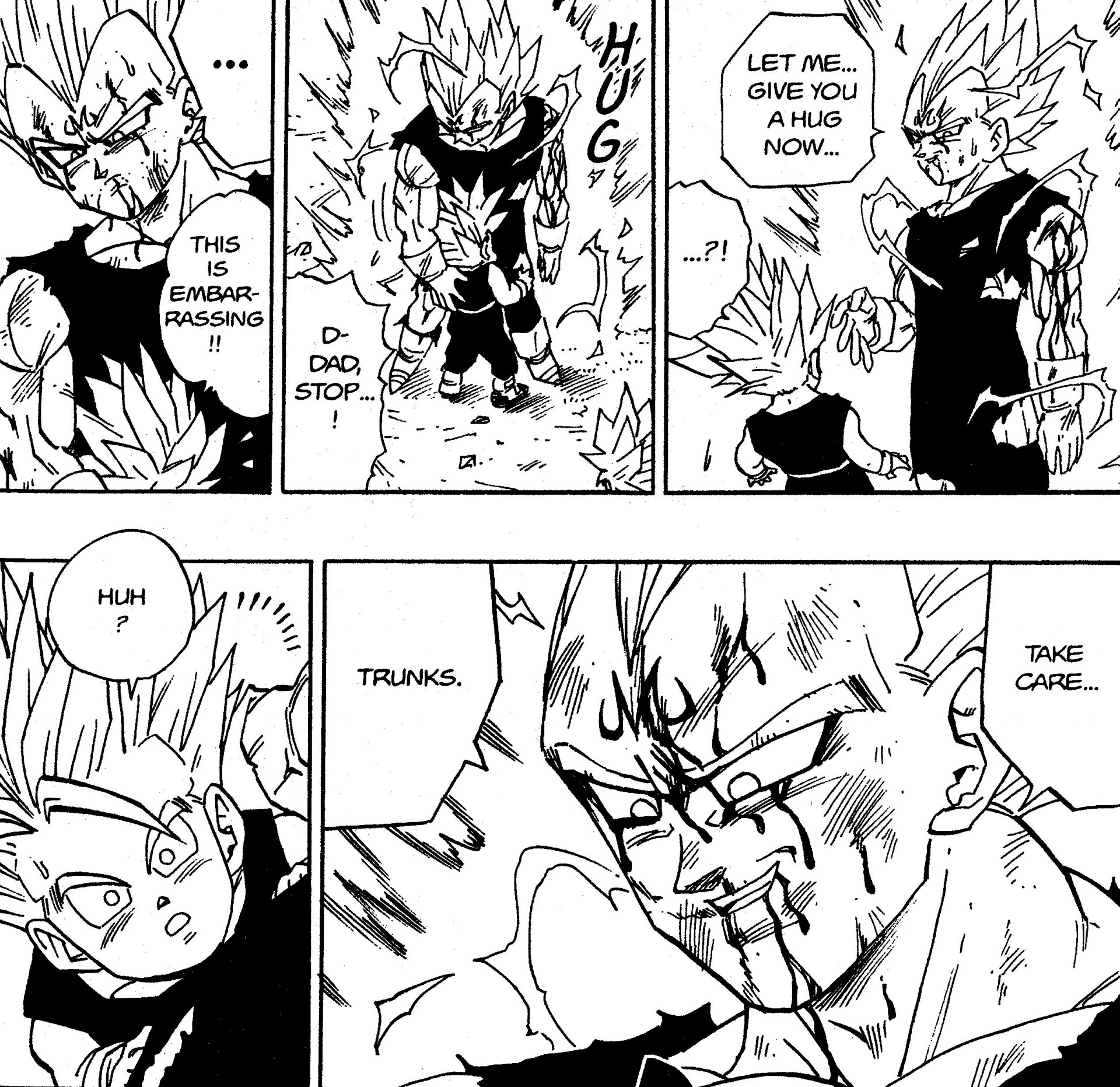 Eine letzte Szene, die wir hervorheben möchten, ist der tränenreiche Abschied zwischen dem Vater-Sohn-Duo Vegeta und Trunks. In den Momenten, bevor er sich Majin Buu zu Vegeta , umarmt Vegeta, wohl wissend, dass dieser Kampf sein Leben fordern würde, seinen geliebten Sohn zum ersten Mal. Da Trunks etwas ratlos ist, verursacht die Wärme von Vegetas Ausdruck, als er zu seinem Sohn sagt, "Pass auf dich auf... Trunks", bei uns sicher Gänsehaut!
