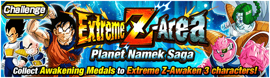 "Extreme Z-Area Planet Namek Saga" läuft! Dies ist ein Event, das Sie nur mit bestimmten Charakteren in Ihrer Gruppe versuchen können, aber wenn Sie den Sieg in den extremen Schlachten erringen, die auf Sie warten, erhalten Sie Erweckungsmedaillen als Belohnung! Extremes Z- Erwecken Sie die zutreffenden Charaktere der Kategorie " Planet Namek Saga", um ihre Anführerfähigkeiten, passiven Fähigkeiten und Planet Namek zu verbessern!