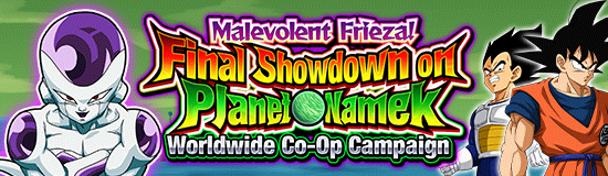 Die "Malevolent Frieza! Final Showdown on Planet Namek Worldwide Co-Op Campaign" ist eröffnet! Nehmen Sie am Event "Extreme Z-Area Planet Namek Saga" teil und räumen Sie die Etappen ab, um zum globalen Clear Count beizutragen und Missionen abzuschließen! Jedes Mal, wenn der Clear Count bestimmte Ziele erreicht, wird der Koop-Missionsrang erhöht. Zusammen mit den Belohnungen, die Sie für jeden Rang erhalten, erhalten Sie Drachensteine, ein "Showdown on Planet Namek " Planet Namek und andere tolle Belohnungen, wenn es Spieler in der Kampagne zum höchsten Rang schafft! Nutze die vereinte Stärke von Dokkan-Kriegern auf der ganzen Welt, um sie alle zu beseitigen!