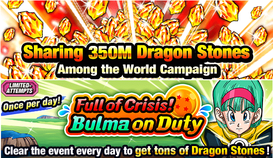 Die Kampagne "350 Millionen Drachensteine unter der Welt teilen" ist ebenfalls im Gange, also räume weiter "Voll der Krise! Bulma im Dienst" und hol dir jeden Tag deine 10 Drachensteine!