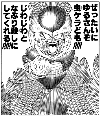 Als er erkennt, dass sein Streben nach ewigem Leben von Vegeta und den anderen vereitelt wurde, explodiert Friezas Wut und er stürzt sich mit blendender Wut in den Kampf.