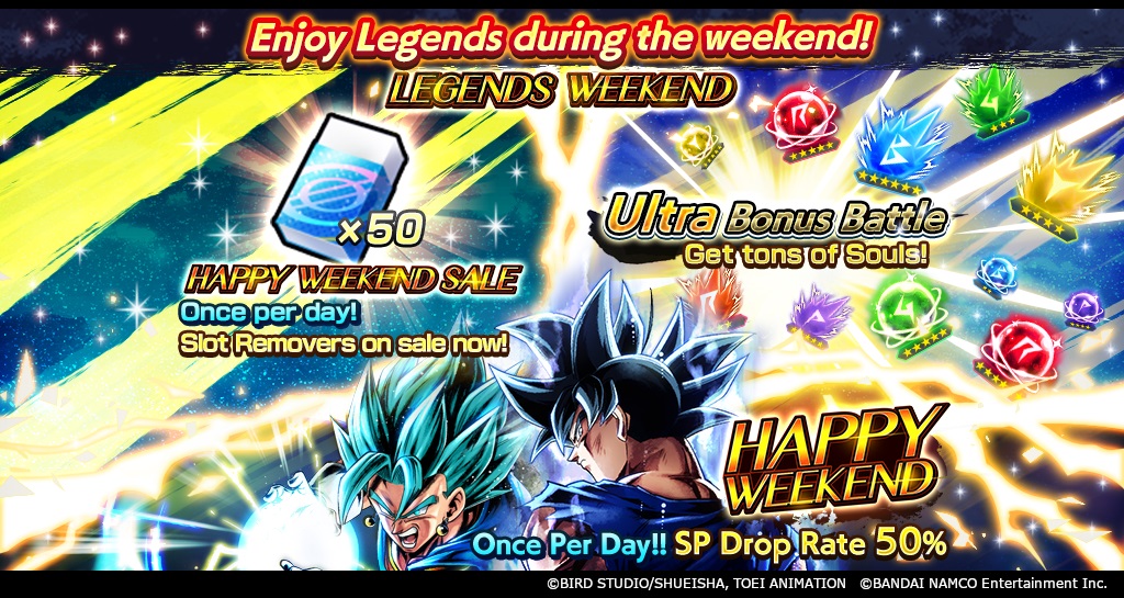 Außerdem da mit die "HAPPY WEEKEND" Beschwörung eine 50 % Chance auf einen SPARKING Charakter einmal am Tag gibt, ist es kein Event, das Sie verpassen können! Spielen Sie diese exklusive LEGENDS-WOCHENENDE-Beschwörung, und Sie haben sogar die Chance, sich einen der LEGENDS-LIMITED-Charaktere in der Aufstellung zu ergattern!