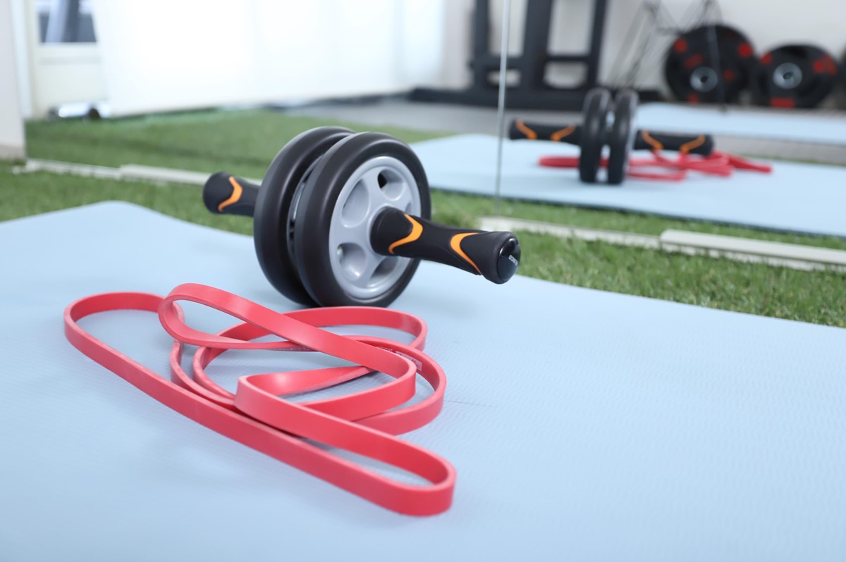 Durch die Verwendung von Trainingsgeräten werden Ihre Trainings effizienter. Wir verwenden zwei Geräteteile, die beide sofort zum online-Bestellen verfügbar, relativ billig und einfach zu zu Hause zu verstauen sind: ein Widerstandsband und ein Bauchrad.