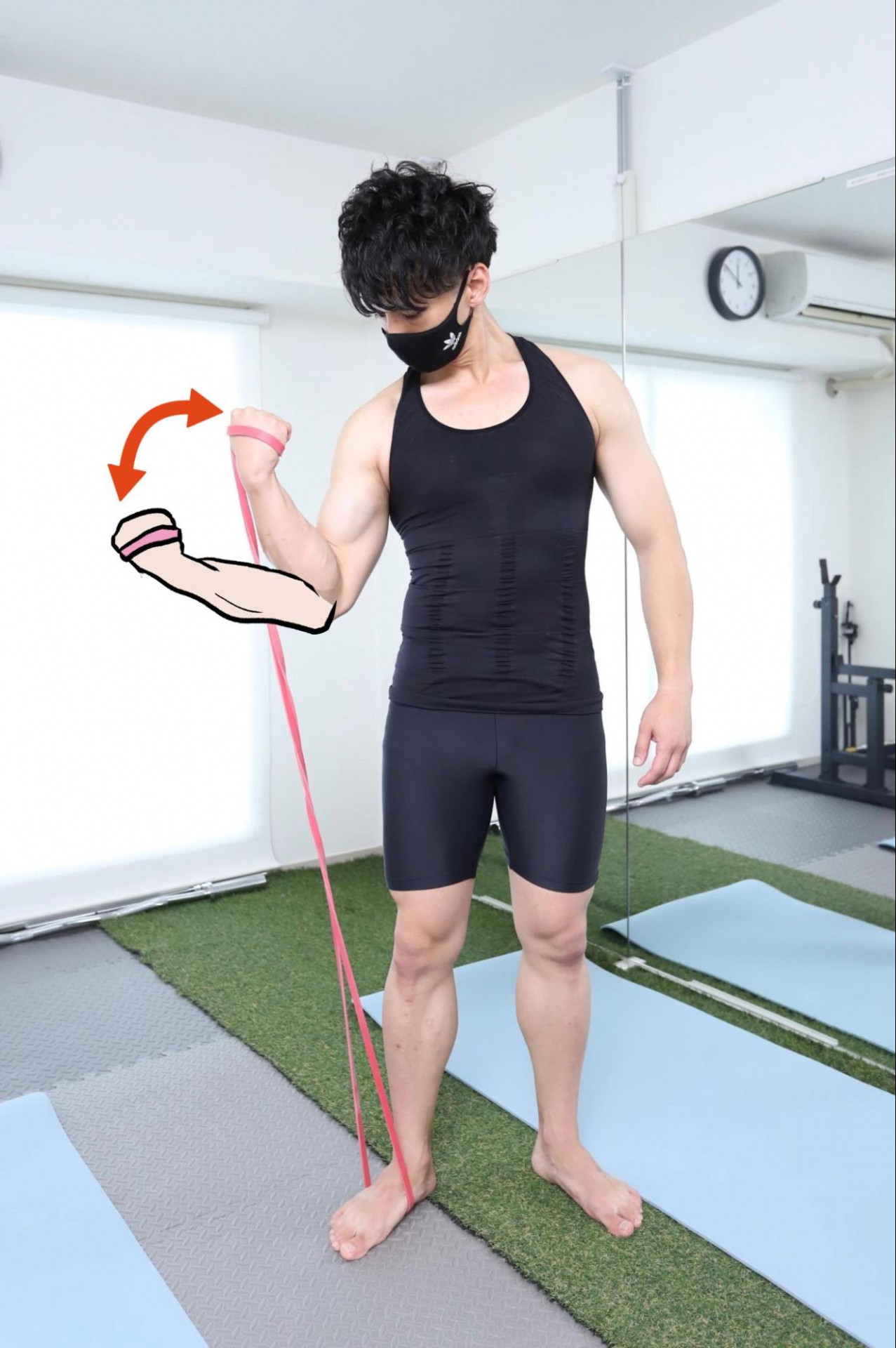 3. Halten Sie das Band fest und rollen Sie Ihren Unterarm nach oben und unten, während Sie Ihren Ellbogen festhalten.