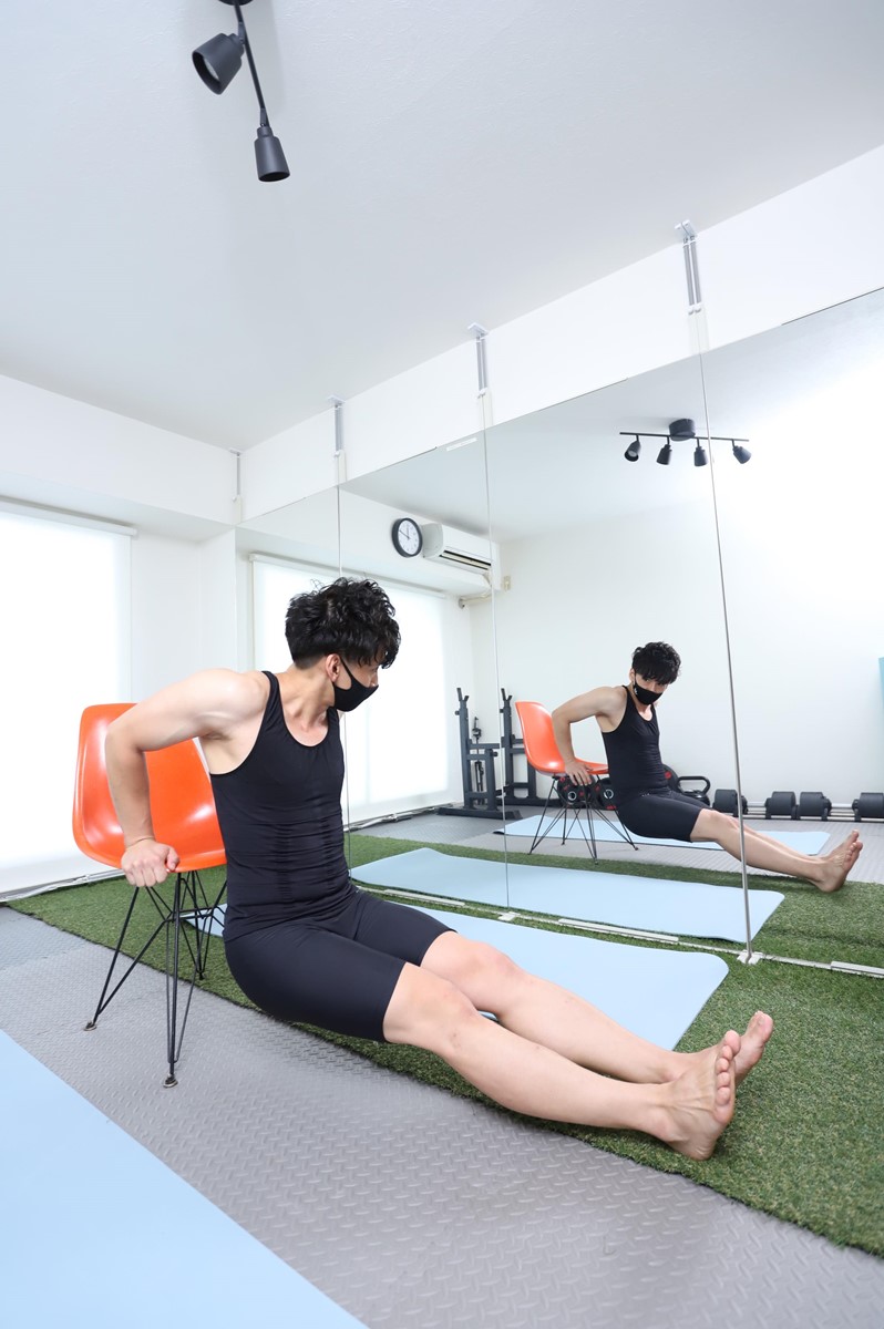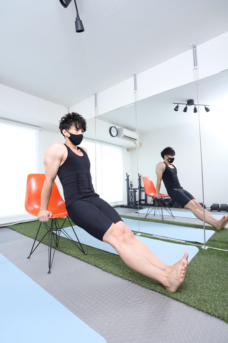 Es gibt nichts, um deinen Körper stabil zu halten, also kann es ein wenig beängstigend sein, bis du etwas Kraft entwickelt hast. Wenn dies der Fall ist, können Sie die Übung gerne anpassen. Wenn Sie Ihre Füße näher an den Stuhl heranbewegen, wird es einfacher, und wenn Sie sie wegbewegen, wird es schwieriger.