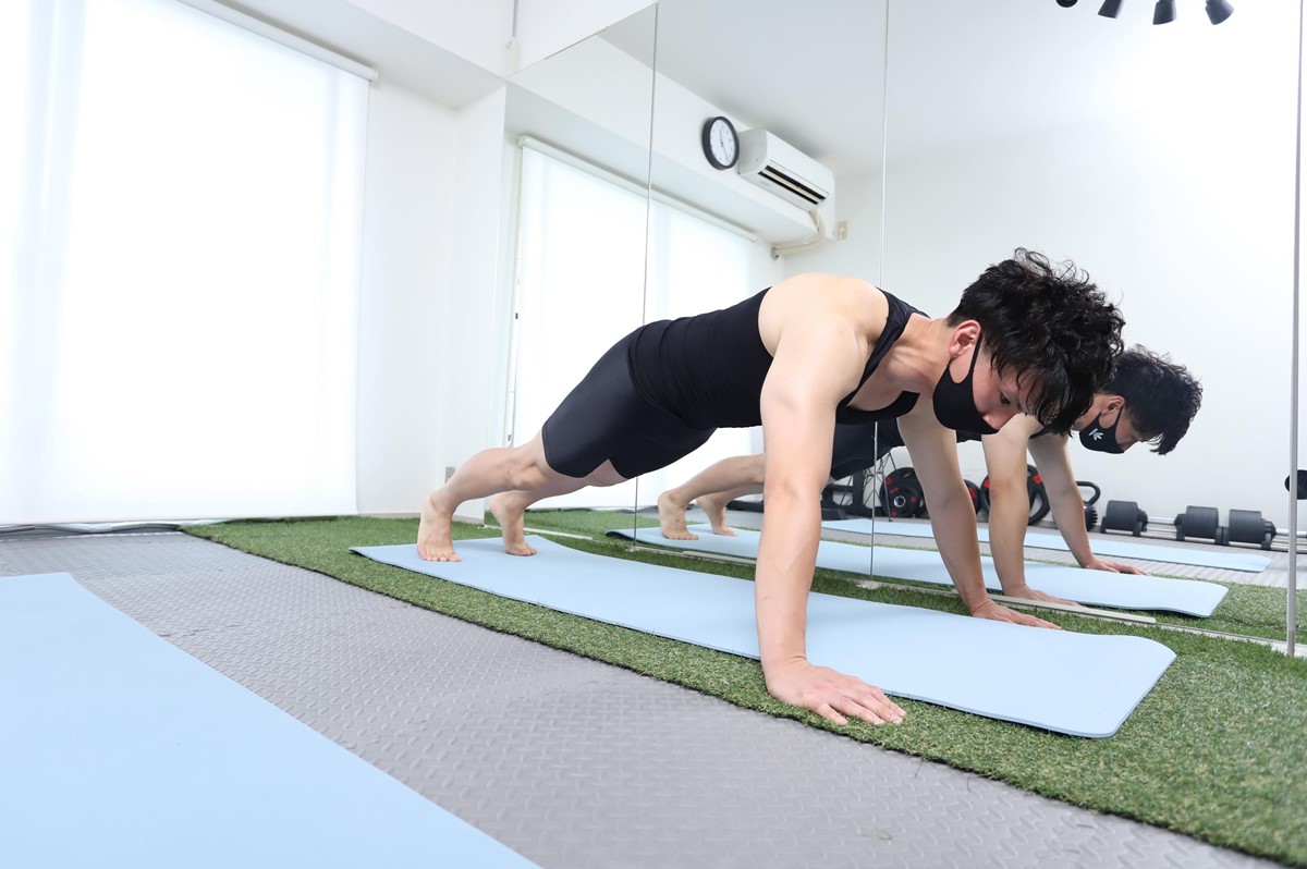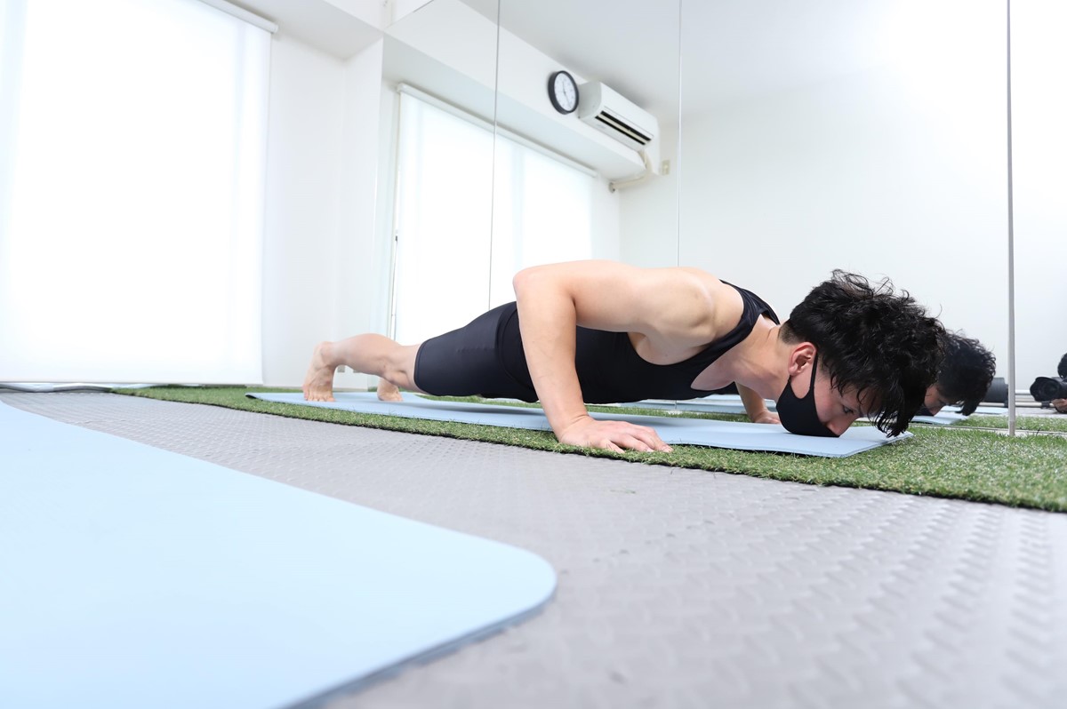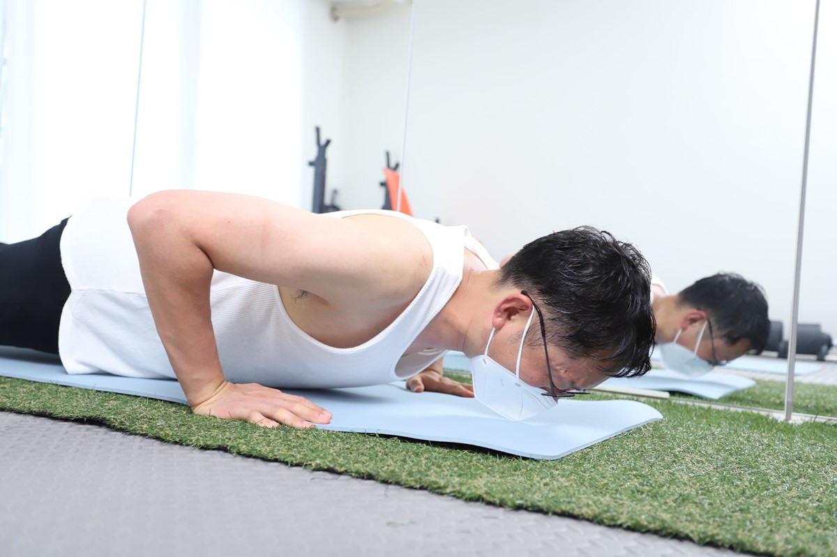 3. Senken Sie die Brust bis knapp über den Boden und kehren Sie dann in die Ausgangsposition zurück.
