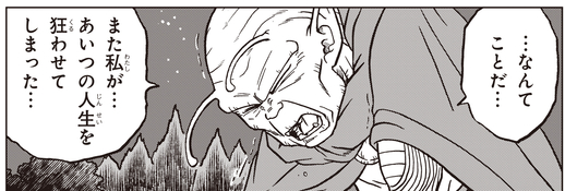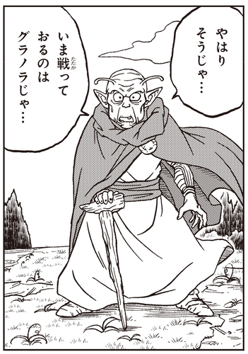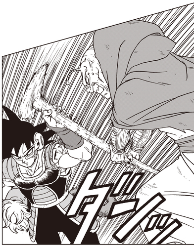 Und hier ist ein Panel, das Monaitos stilvolle Kleidung hervorhebt. Schauen Sie sich seinen geschwungenen Umhang an und die Art und Weise, wie er um den Hals gekräuselt ist - eine beliebte Modewahl bei Namekianern, wie es scheint! Leider kann Monaito nicht mehr so gut laufen, aber die Art, wie er es allein mit einem Stab geht, zeigt seine Hartnäckigkeit und raue, altmodische Coolness!