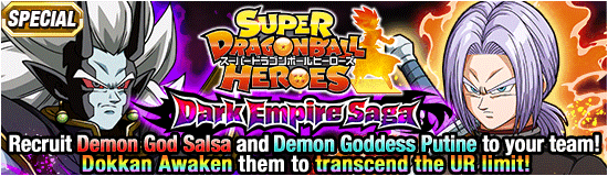 Dem Sonderevent „Super Dragon Ball Heroes: Dark Empire Saga“ wurde eine neue Bühne hinzugefügt! In dieser neuen Phase habt ihr die Möglichkeit, die Demon Goddess Putine[der verräterische Zauberer] zu rekrutieren! Außerdem kannst du Dokkan-Awaken-Charaktere aus der Crossover-Beschwörung wie [Mission to Protect History] Goku (Xeno) und [Battle Beyond Space and Time] Vegeta (Xeno) mit den Awakening-Medaillen dieses Events erwecken!!