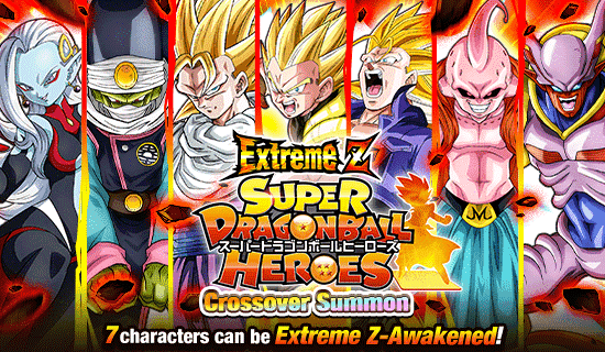 Im neuen Extreme-Z Battle kannst du 7 Charaktere aus Super Dragon Ball Heroes mit Extreme-Z erwecken! Extreme-Z Awakening wird ihre Anführerfähigkeiten, passiven Fähigkeiten und Superangriffe stärken. Außerdem ist die "Extreme Super Dragon Ball Heroes Crossover-Beschwörung" ebenfalls aktiv und gibt dir eine Chance, mehr Crossover-Charaktere zu bekommen, die Extreme-Z Awakening fähig sind!