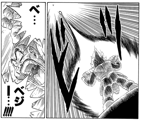 Vegeta hatte genug gesehen und befahl Nappa , sich zurückzuziehen, aber das bedeutete nur, dass er mit Goku fertig war – nicht mit den anderen! Stattdessen richtete er sein Augenmerk auf Gohan und Krillin und dachte daran, die beiden schwächeren Krieger gnadenlos zu eliminieren, wurde jedoch schnell von Goku mit seiner neuen Kaio-ken Technik besiegt.