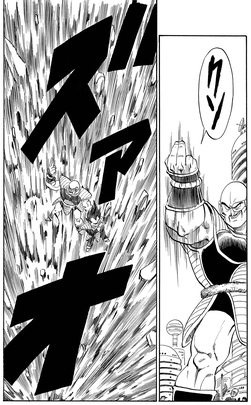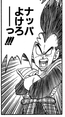 Nicht in der Lage, auf Gokus Ankunft zu warten, um die Kämpfe zu beginnen, brüllte Nappa : "Vergiss das Warten!!!" bevor er versuchte, in die Schlacht zu stürzen, weil ihm danach war, und als er Krillins Kienzan, schnaubte er nur, dass es nur ein "Salontrick" war, und entschied sich dafür, es direkt zu nehmen!