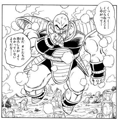 Als er mit Piccolo, Gohan, Krillin und den anderen Helden der Erde konfrontiert wurde, spießte er die Saibaimen auf sie, um ihre Stärke zu testen, anstatt sie selbst zu bekämpfen. Als die Saibaimen jedoch überraschend besiegt wurden, schritt Nappa ein, um den Widerstand persönlich zu zerschlagen.