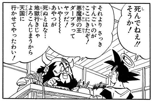 Nachdem er von Majin Buu verschlungen wurde, findet Dabura sein Schicksal der Gnade von Lord Enma ausgeliefert, der erkennt, dass der König des Dämonenreichs nichts mehr als eine einfache Fahrkarte in die Hölle möchte, und schickt ihn direkt in den Himmel!