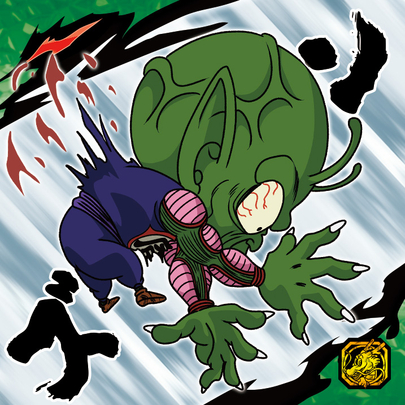 Neige den "Changing Rare"-Aufkleber in verschiedene Winkel, um den aufregenden, wenn auch tragischen (für Piccolo -Fans) Höhepunkt von Gokus Showdown mit der Verkörperung des Bösen selbst noch einmal zu erleben!