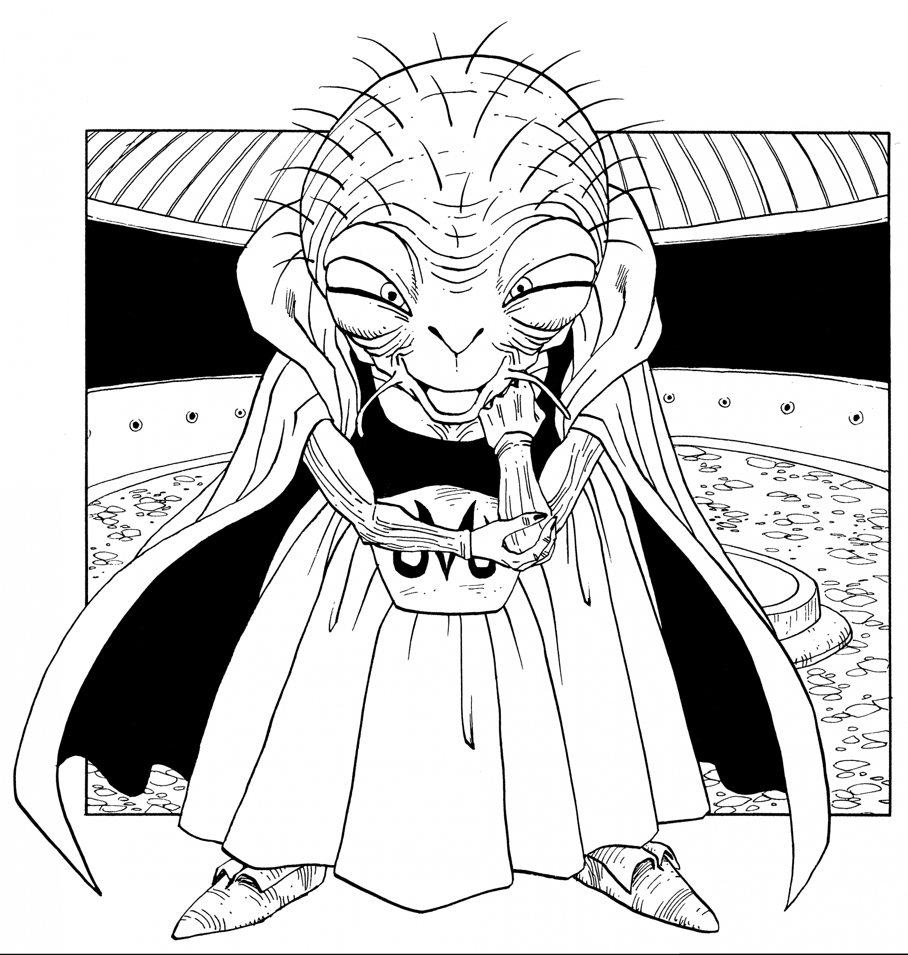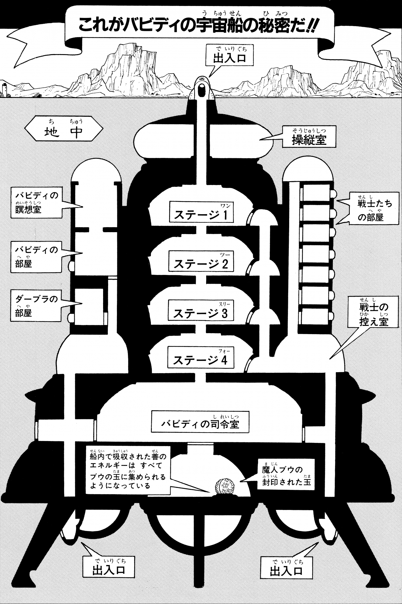 In diesem Raumschiff traf der böse Zauberer Babidi seine Vorbereitungen, um Majin Buu wiederzubeleben. Er versteckte sein Schiff unter der Erde, wo der Supreme Kai und Kibito es nicht finden konnten, mit nur einem kleinen, kaum wahrnehmbaren Eingang über der Erde. Mit nur einem Gebäude in der Umgebung war es praktisch menschenleer. Goku und die anderen bestiegen das Schiff durch den Eingang, nur um festzustellen, dass sie durch mehrere Stockwerke hinabsteigen und Babidis Schergen auf dem Weg besiegen mussten, um den Kontrollraum zu finden, in dem sich Babidi selbst befand.