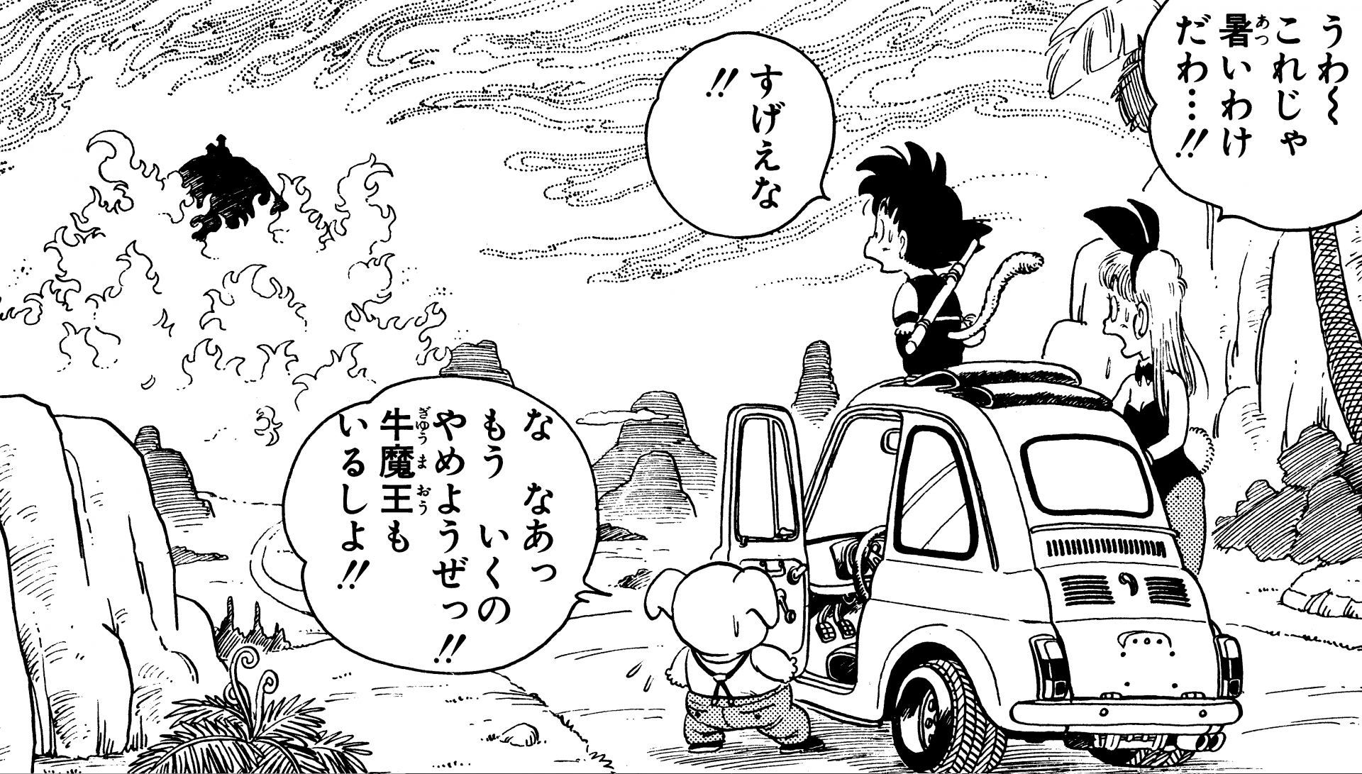 Mit der großen Burg von Gyumao, die auf ihrem Gipfel inmitten ewig brüllender Flammen ruht, ist der Fry-pan Mountain wirklich ein unvergesslicher Anblick! Früher war er als "Angenehmer Berg" bekannt und machte seinem Namen als friedlicher Ort mit gemäßigtem Klima alle Ehre, aber eines Tages soll ein Feuergeist vom Himmel gefallen und den Berg in Flammen gesetzt haben, wodurch die gesamte Gegend in eine glühende Hitze verwandelt wurde Ofen. Goku und seine Gefährten suchten Kamesennin auf, um einen speziellen Ventilator namens Bashosen zu holen, um die Feuer zu löschen, nur um herauszufinden, als sie ihn fragten, dass er ihn versehentlich weggeworfen hatte! Der betagte Kampfkunstmeister nahm die Sache dann buchstäblich selbst in die Hand und blies das Feuer mit seiner Unterschrift Kamehameha aus. Unglücklicherweise für Gyumao hat er es jedoch ein wenig übertrieben und am Ende auch den gesamten Berg weggeblasen!