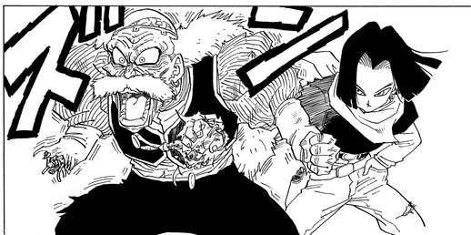 Zunächst scheint es, als hätte Android 17 seine Lektion gelernt und wird Dr. Geros Befehlen gehorchen, aber es stellt sich heraus, dass dies nur ein Trick ist, um an die Fernbedienung zu gelangen, mit der er wieder deaktiviert werden kann. Nachdem sich der Spieß umgedreht hat und er nicht wieder in Stasis versetzt werden kann, zerstört Android 17 seinen Schöpfer und ehemaligen Meister gnadenlos.