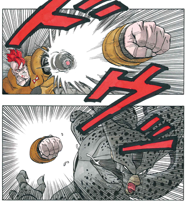 Android 16 löst seine beiden Unterarme und enthüllt zwei Kanonen, aus denen er einen reißenden Strahl roher Energie auf seinen Gegner entfesselt. Dieser Schritt ist einzigartig für Android 16 und wird durch seine vollständig mechanische Konstruktion ermöglicht.