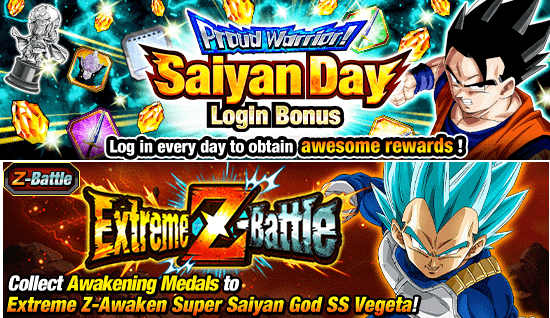 Holen Sie sich mit Ihrem ersten Login während des „Proud Warrior! Saiyan Day Login Bonus“-Zeitraums ein spezielles Hintergrundbild, das von Toyotarou selbst gezeichnet wurde!! Außerdem steht ein neues Extreme Z-Battle bevor, in dem Sie Extreme Z-Awaken [Observance of Pride] Super Saiyan God SS Vegeta! Melden Sie sich bei Dokkan Dokkan Battle an und genießen Sie die Feierlichkeiten zum Saiyajin-Tag, solange sie andauern!