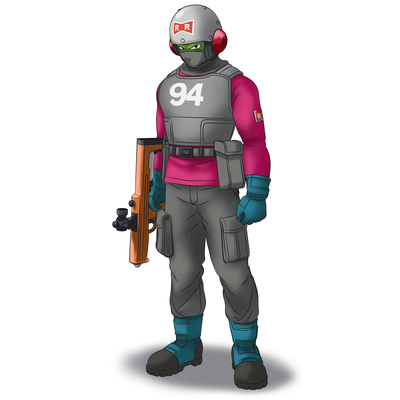 Wir können auch sehen, dass er eines der hochmodernen Lasergewehre der Red Ribbon Army trägt, das mit einer Art Gasflasche statt mit einem Magazin geladen ist!